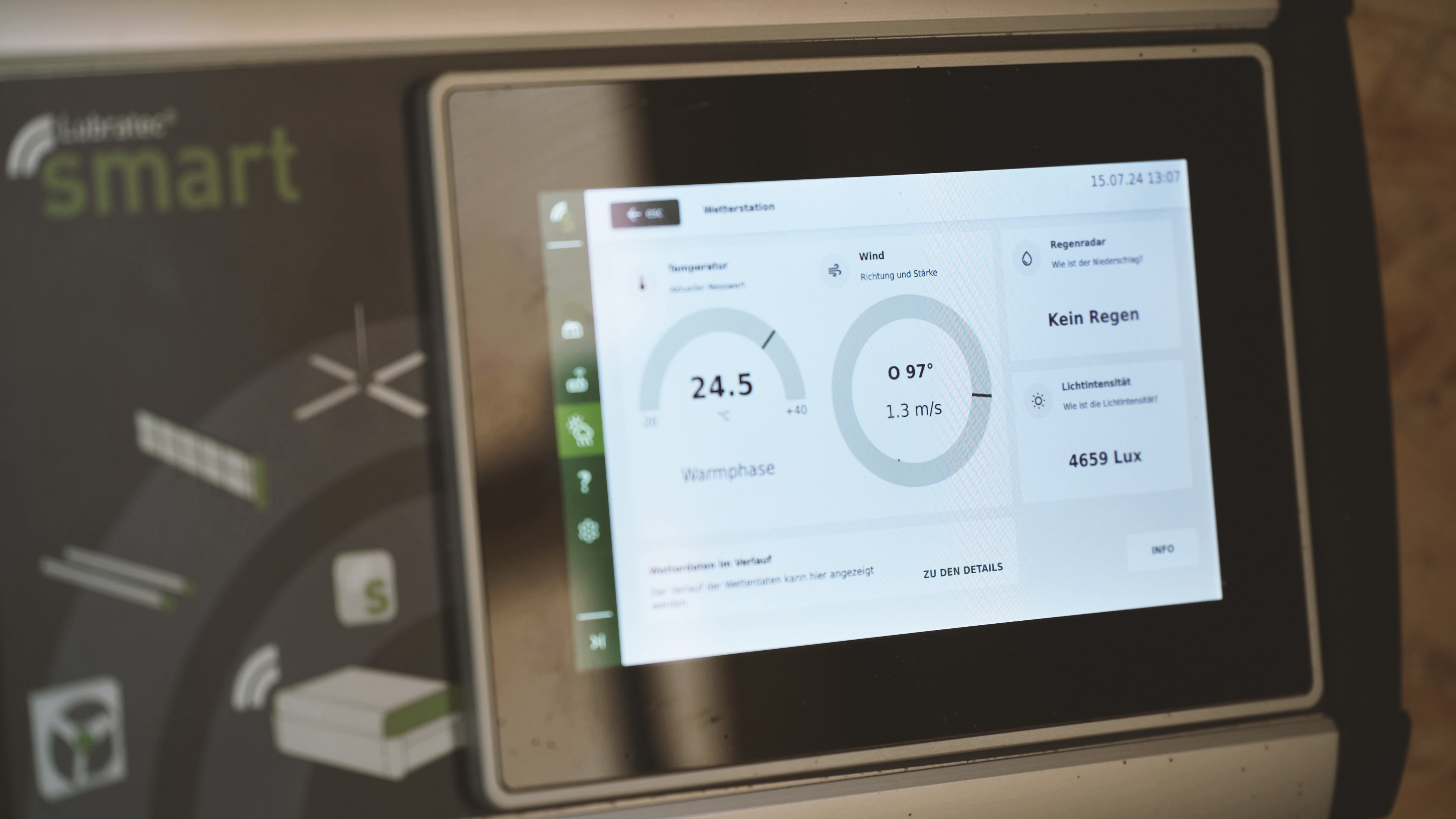 En las tres fases climáticas, Lubratec Smart garantiza la interacción perfecta de la ventilación, los ventiladores y la humidificación opcional. La base para ello es el registro continuo de las influencias ambientales relevantes, como la temperatura, la dirección y la fuerza del viento, las precipitaciones, la humedad, los gases nocivos (especialmente el CO₂) y las condiciones de iluminación. Los datos meteorológicos locales y su progresión también se registran a través de una estación meteorológica específica para que todos los productos de clima estable Lubratec conectados puedan controlarse de forma proactiva y especialmente eficiente, y el control de la iluminación también está totalmente integrado en el sistema. El nivel de iluminación LED se controla mediante programas de tiempo libremente definibles (por ejemplo, 16 horas de luz / 8 horas de oscuridad, y viceversa para las vacas secas), incluido el modo nocturno. Cuando hay suficiente luz en el exterior, la luz se apaga automáticamente y ahorra energía. El encendido y apagado es siempre suave y respetuoso con el animal para evitar el estrés.