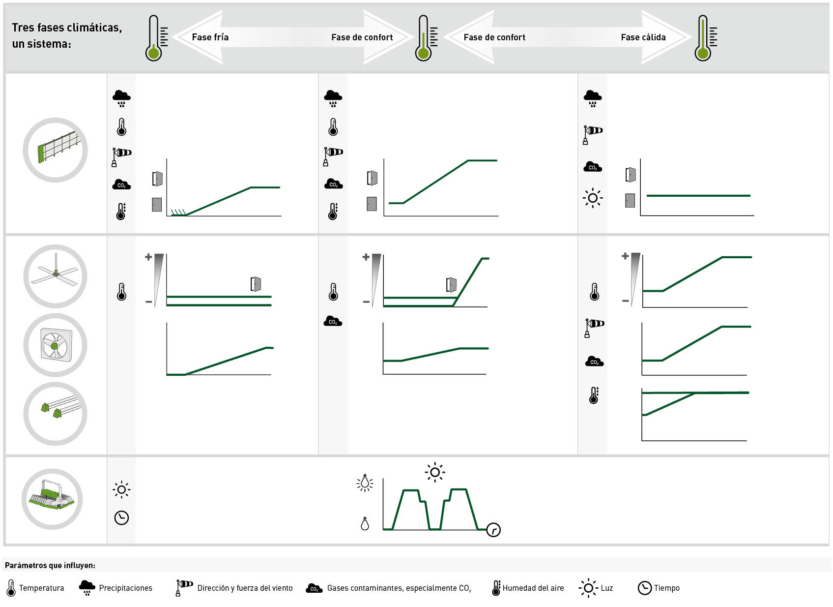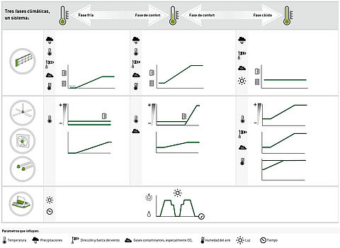 En la fase de confort, el control de la ventilación depende principalmente de la temperatura. El sistema está siempre preparado para reaccionar rápidamente a los cambios meteorológicos. Los ventiladores también garantizan una tasa mínima de intercambio de aire, especialmente cuando no hay viento.