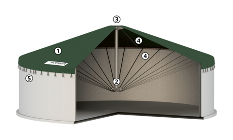 La cubierta de silo resistente a la intemperie Cogatec cubre su tanque de manera que reduce las emisiones y de esta manera garantiza una reducción permanente de las emisiones y los gases producidos por la agricultura. La columna central de acero inoxidable utilizada de serie también permite cubrir grandes contenedores con un diámetro de hasta 50 m. Nuestro sistema de tejado se dimensiona cuidadosamente según la ubicación respectiva y se adapta a las condiciones específicas.