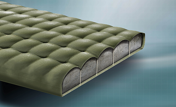 Los colchones geosintéticos para hormigón constan de dos capas de tejido de alta resistencia que se rellenan in situ con hormigón fluido. Se crea así una capa protectora estable y adaptable que se adapta perfectamente a las formas complejas del terreno, tanto por encima como por debajo del agua.